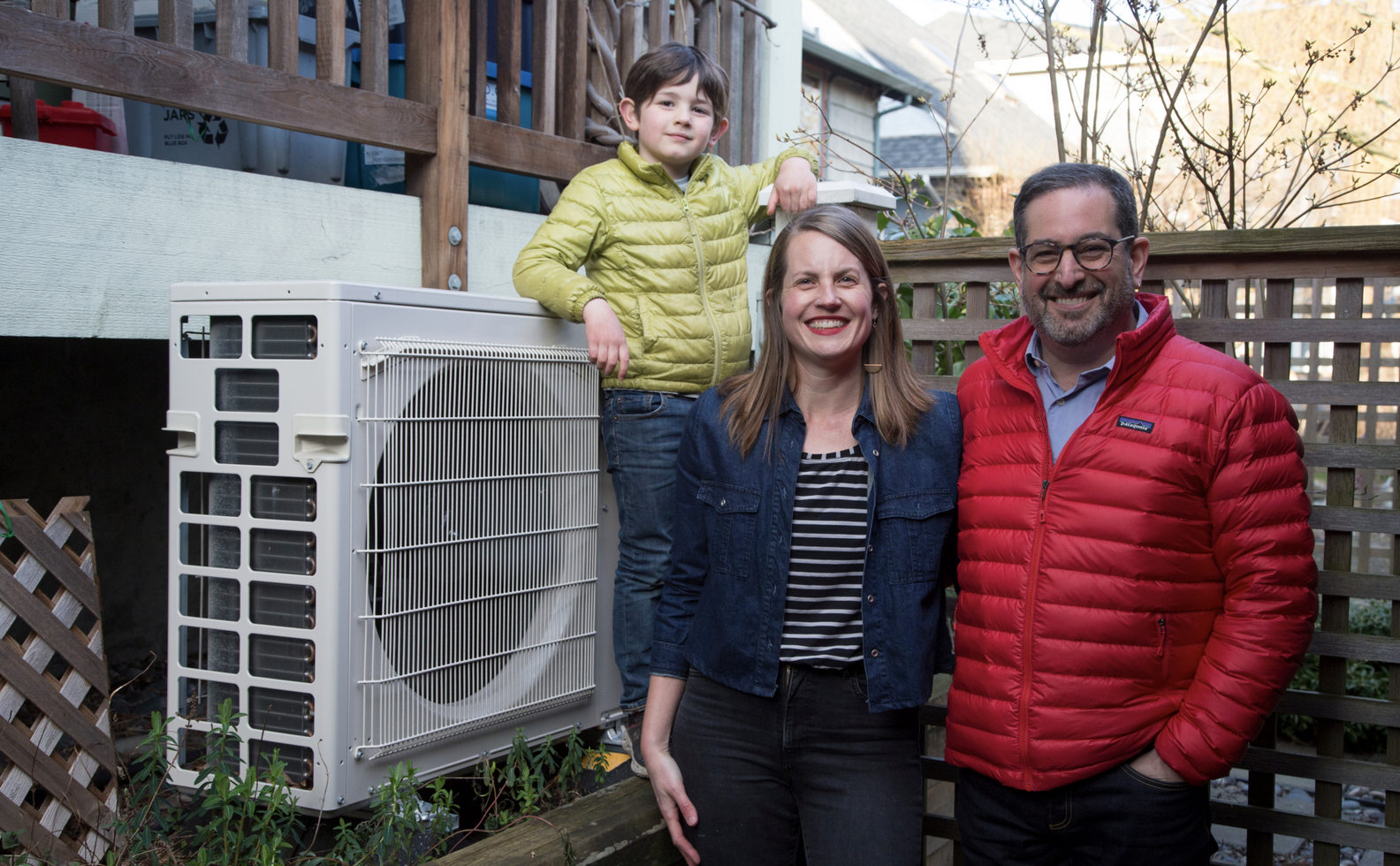 Seth on the right, with son Aaron and wife, Vancouver city councillor Christine Boyle, pose with the external heat pump. Photo by David Bishop, Bring it Home 4 The Climate