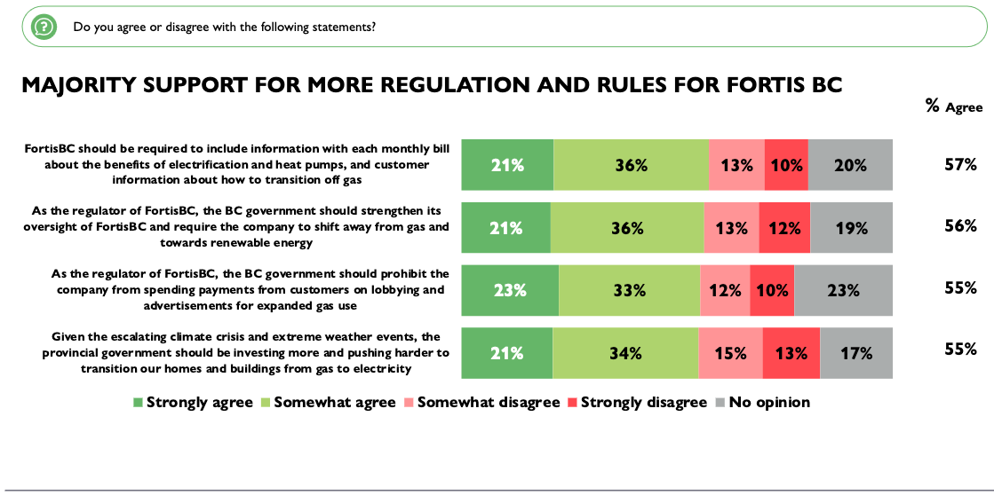 57 per cent of BC residents agree that “FortisBC should be required to include information with each monthly bill about the benefits of electrification and heat pumps, and customer information about how to transition off gas,” something the BC government, with oversight of this regulated monopoly, is well within its power to demand. Conversely, only 23 per cent of respondents were opposed to this idea.